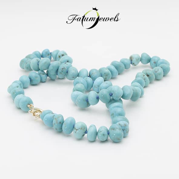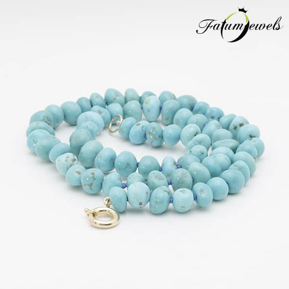 Egyes ezoterikus elméletek szerint a türkiz megóv az eséstől, továbbá abban is segítségére van viselőjének, hogy ne billenjen ki lelki egyensúlyából. Ez a Fatumjewels türkiz nyaklánc 68 szem nagyobb méretű türkizből áll, melynek csodálatos színét kiemeli az aranykapocs. Óvd meg lelki és fizikai egészségedet Fatumjewels türkiz nyaklánc viselésével.