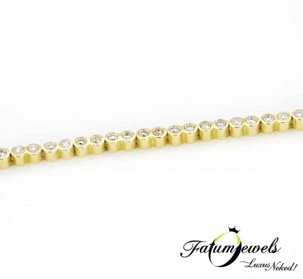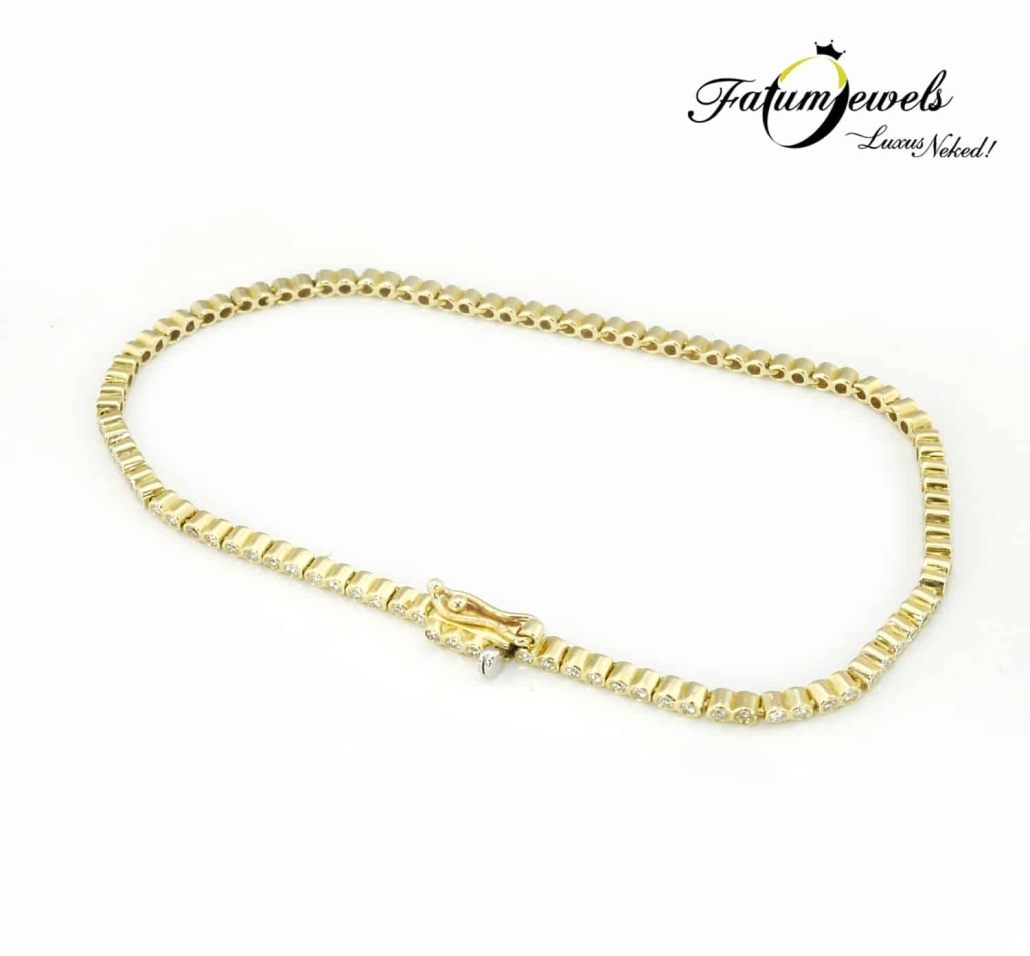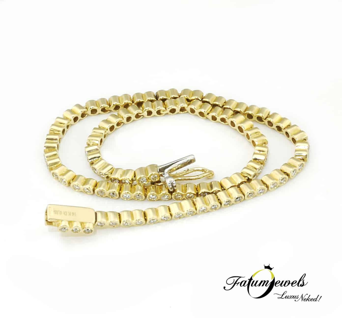 A tenisz karkötő egyértelműen arra utal, hogy viselője aktív életet él. Szeretnéd ezt kifejezni ékszereid révén? Akkor a Fatumjewels Galéria éppen a Te számodra tervezte ezt a briliáns gyémánt drágakövekkel díszített sárga arany tenisz karkötőt. Fejezd ki ékszereid révén, hogy ki vagy valójában!